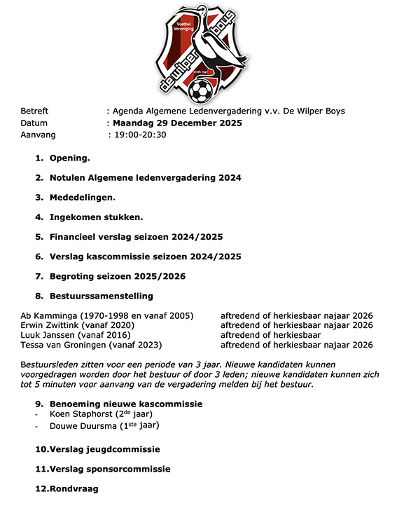 Voor alle vrijwilligers van De Wilper Boys: We willen jouw inzet graag waarderen en we nodigen je hierbij uit voor de Vrijwilligersavond met voorafgaand een korte Algemene Leden Vergadering op maandag 29 december 2025 om 19:00 uur.